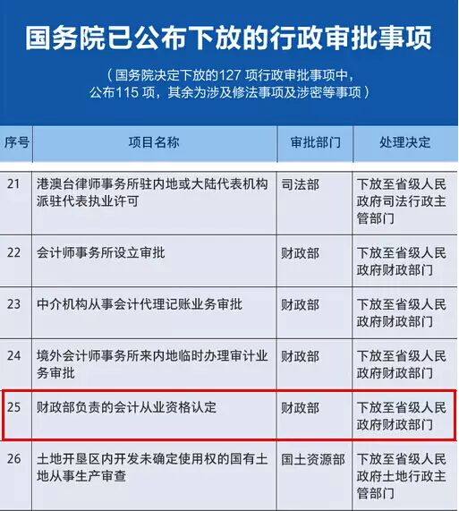 經(jīng)過網(wǎng)上搜索查證后,叔已經(jīng)確認(rèn)了這其實(shí)是國務(wù)院精簡行政審批權(quán)的一個事項(xiàng)大匯總。并不是最新的消息,今年2月14日,有相關(guān)媒體引用了人民網(wǎng)和中國政府網(wǎng)的權(quán)威報道稱:國務(wù)院已下放會計(jì)從業(yè)資格認(rèn)定行政審批權(quán)至省級人民政府財(cái)政部門。